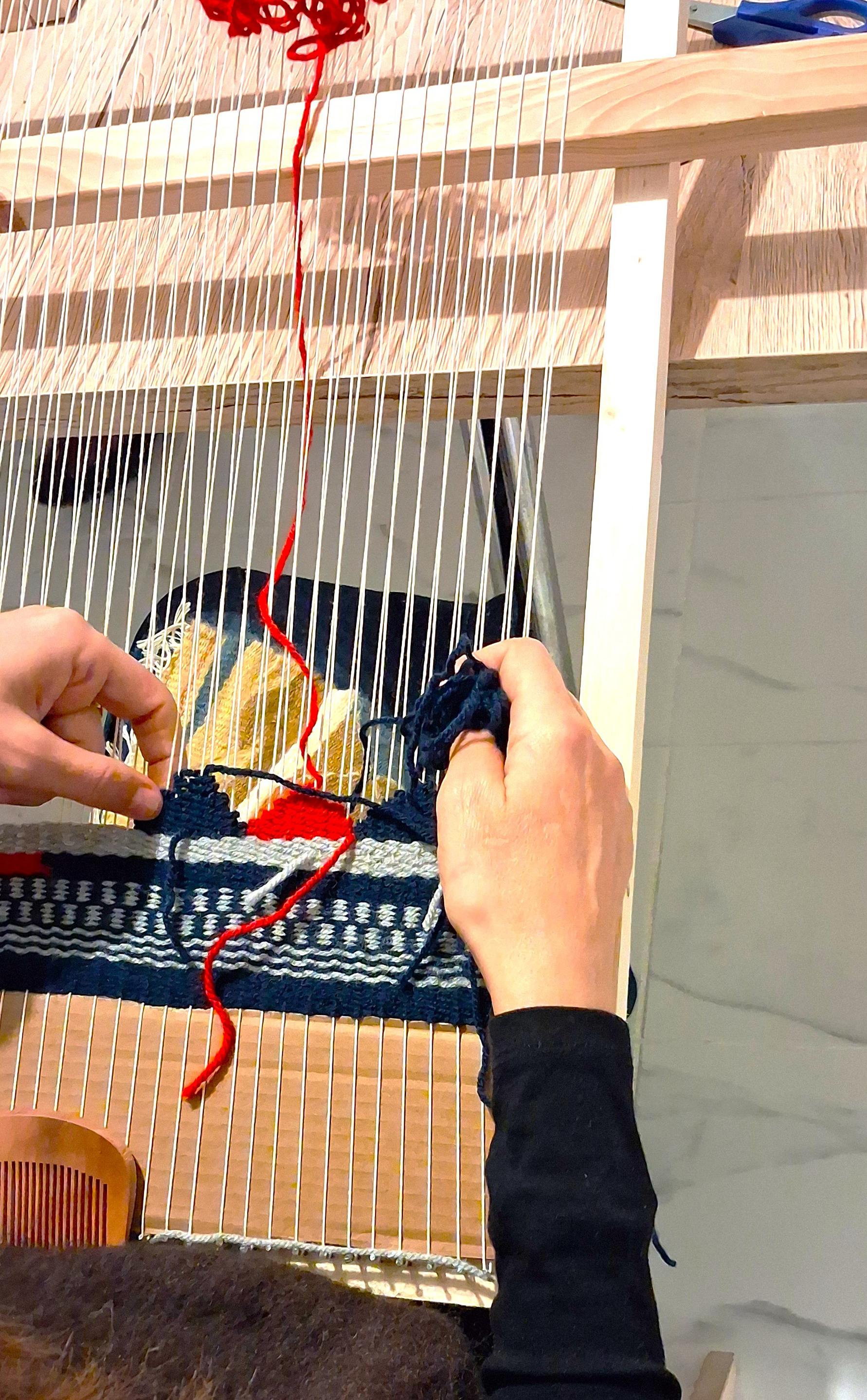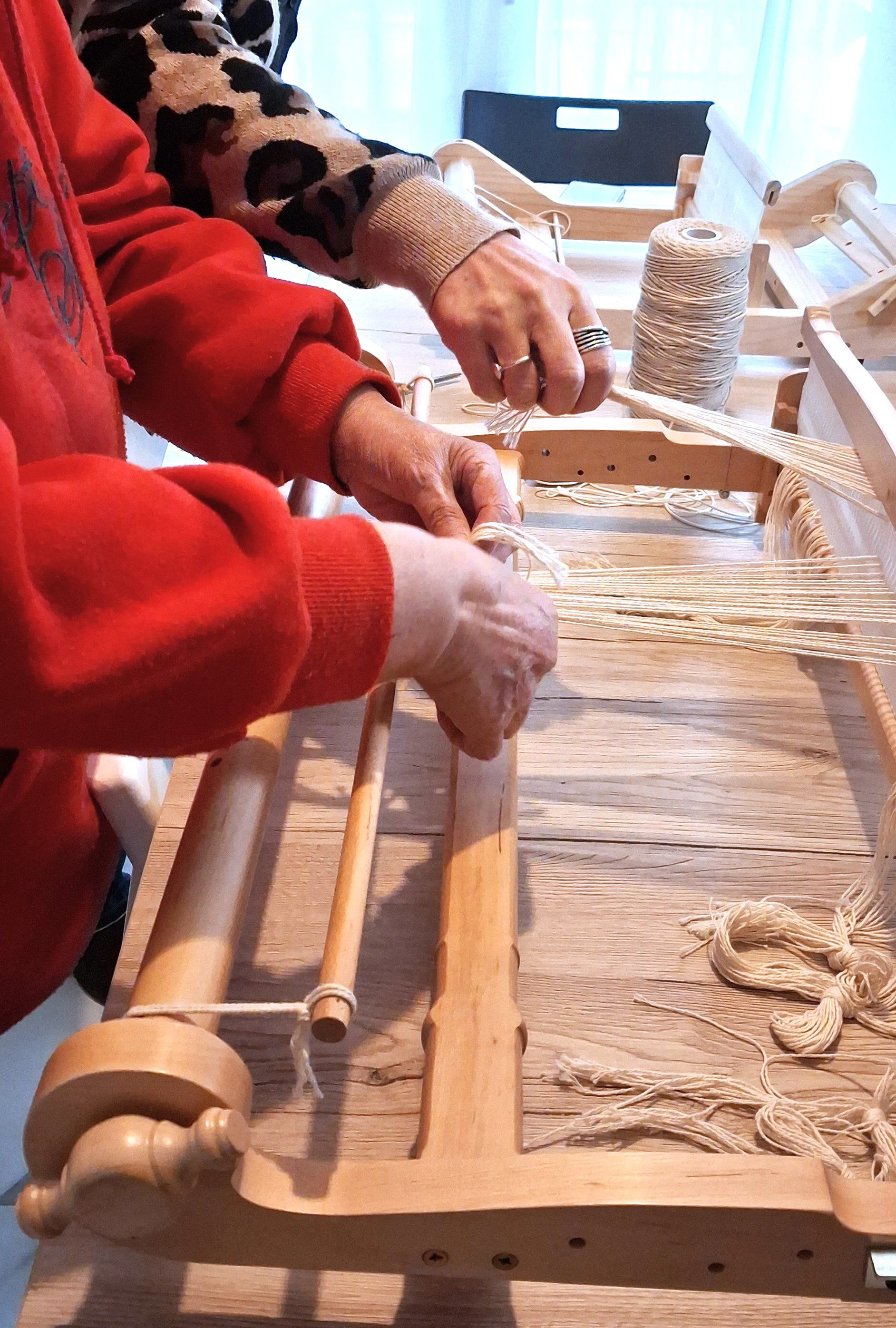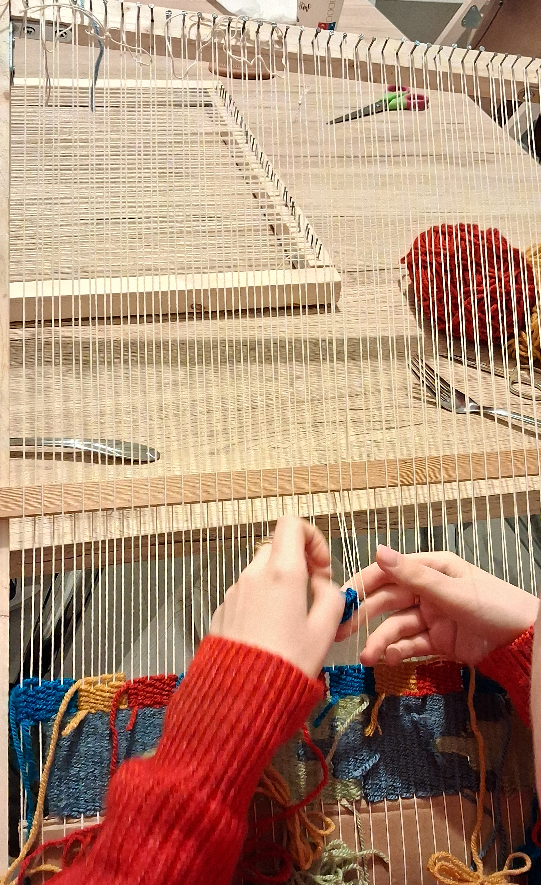 Στον όρθιο αργαλειό ο μαθητής μαθαίνει την υφαντική δουλεύοντας με τα χέρια του τα στημόνια σε πιο ολοκληρωμένη μορφή.