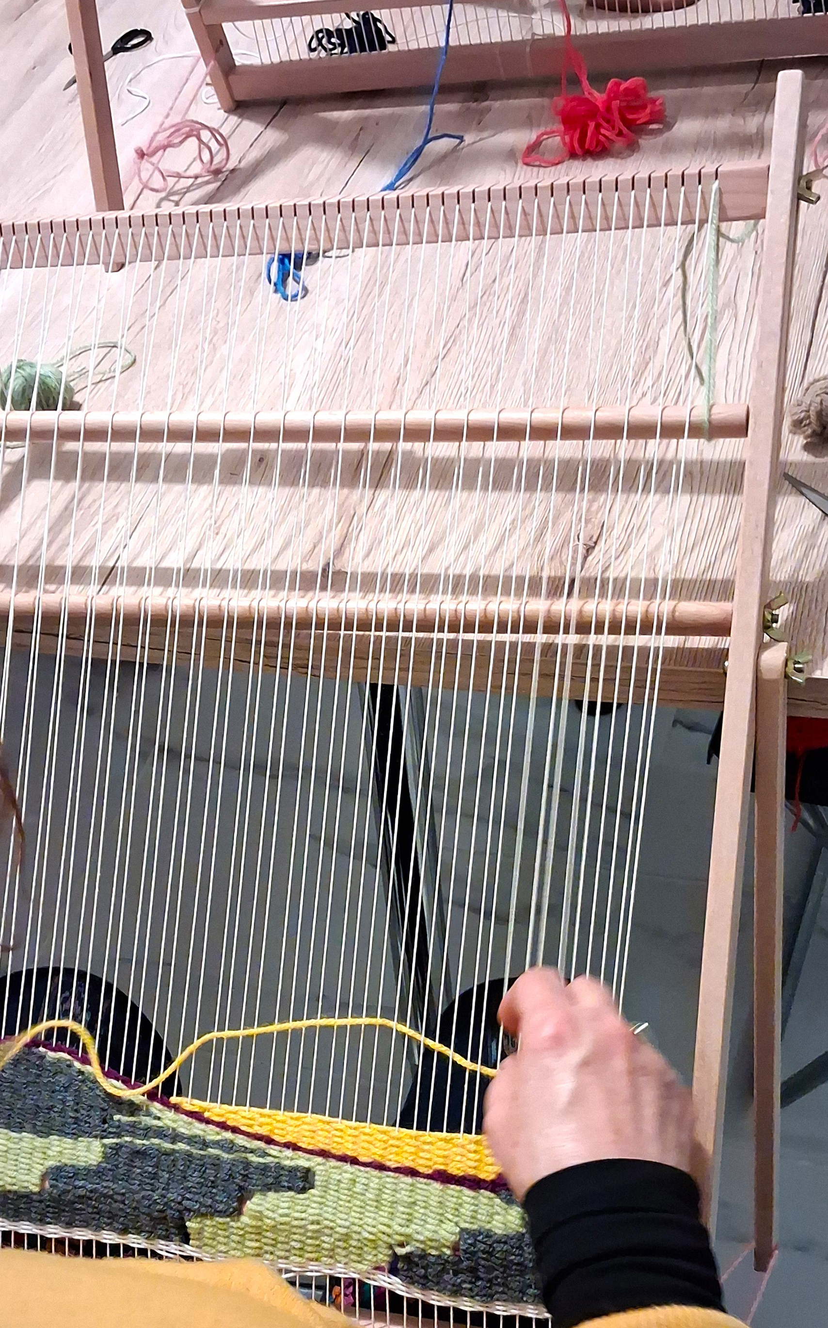 Εμείς κατά την διάρκεια των μαθημάτων, σας παρέχουμε το τελάρο, τον αργαλειό και τα νήματα ώστε να δημιουργήσετε τον δικό σας πίνακα, ύφασμα ή ακόμα και αξεσουάρ (κασκόλ, τσάντα μαξιλάρι κλπ).